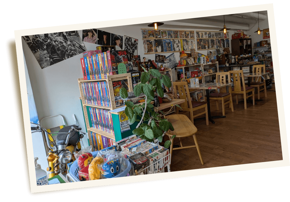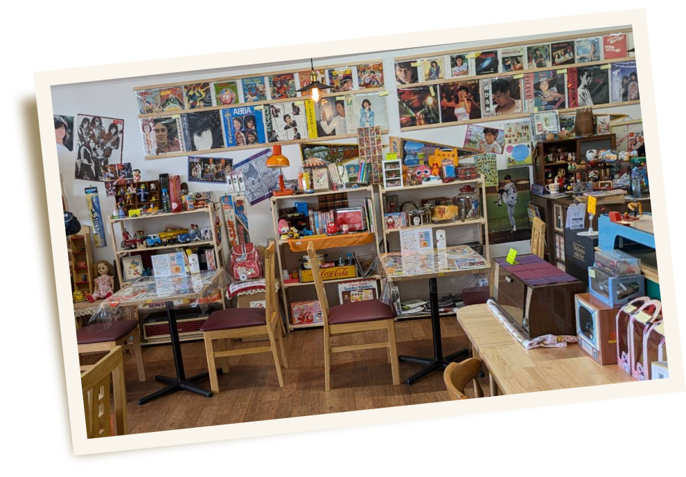 店内には昭和のおもちゃや雑誌、レコードが並び、